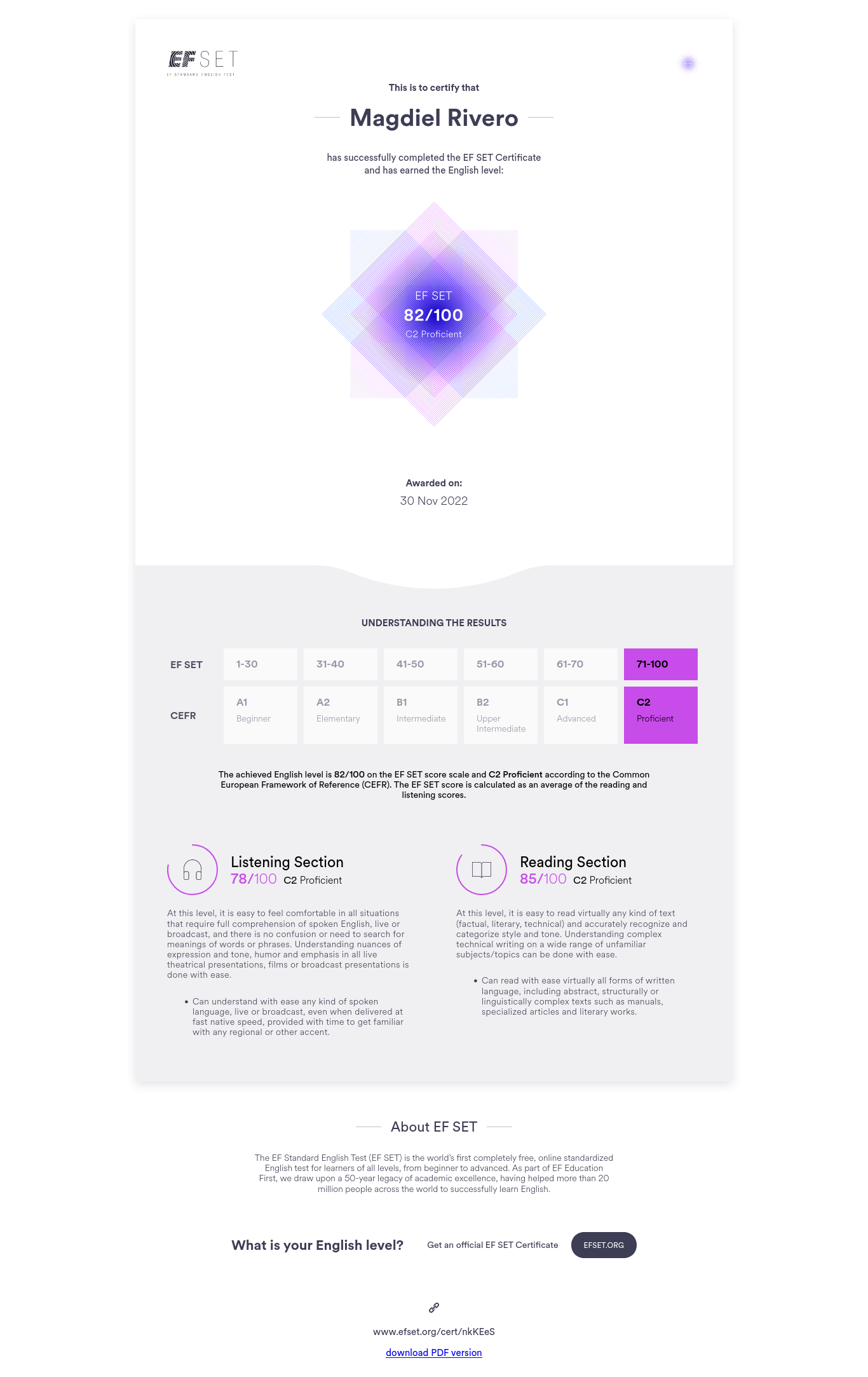Go to testEF SET English Certificate 82/100 (C2 Proficient)