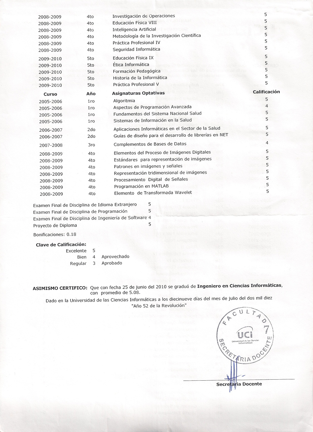 - Perfect score of 5 out of 5 in the final exam for the programming discipline, earning the "advanced" category, a distinction achieved by less than 5% of graduates.