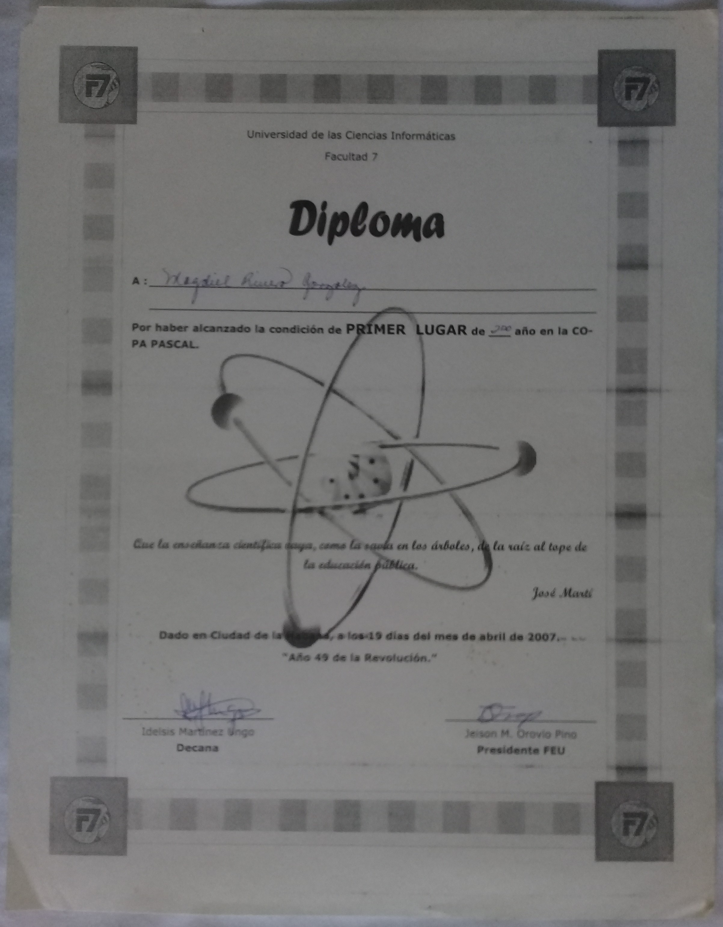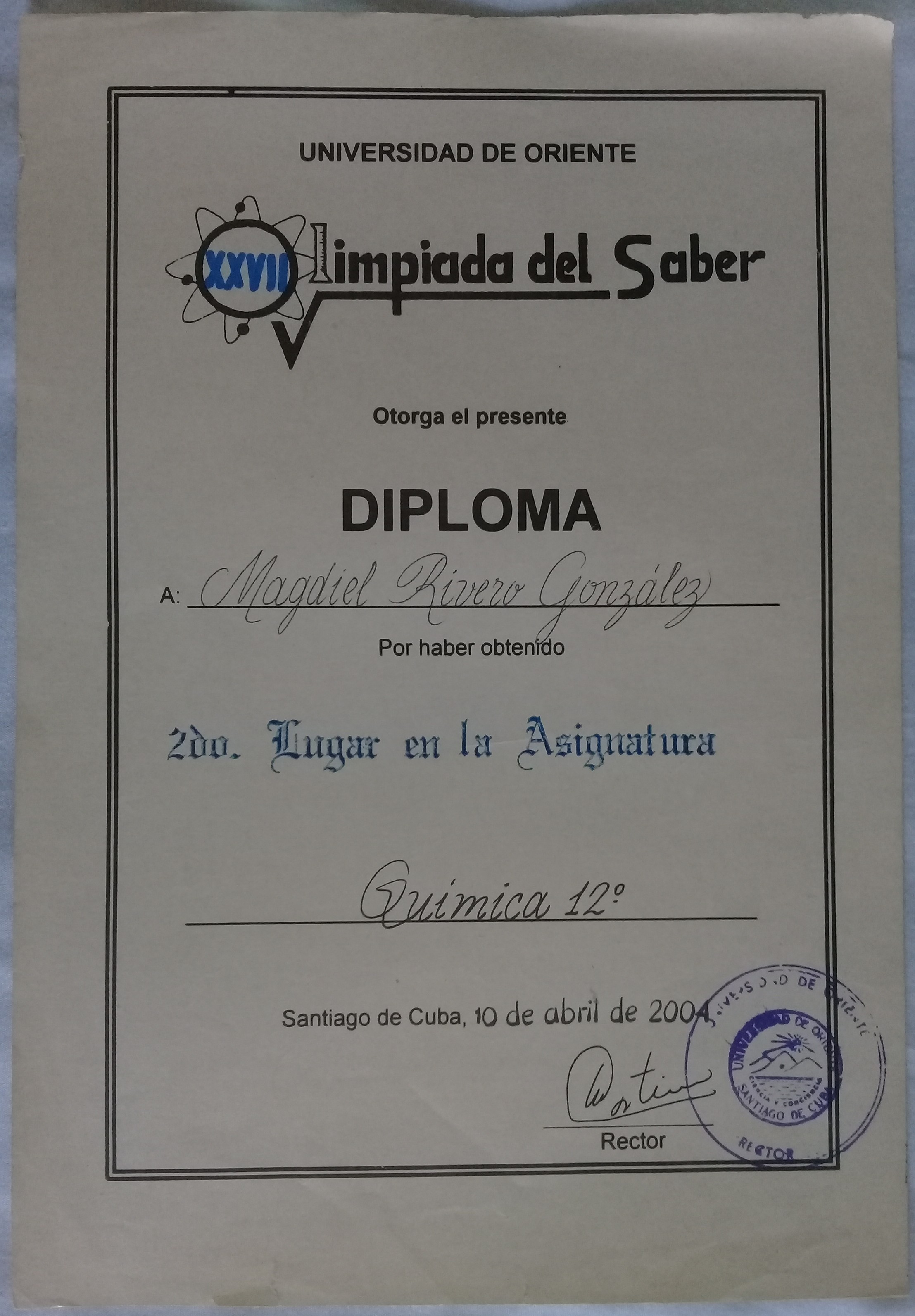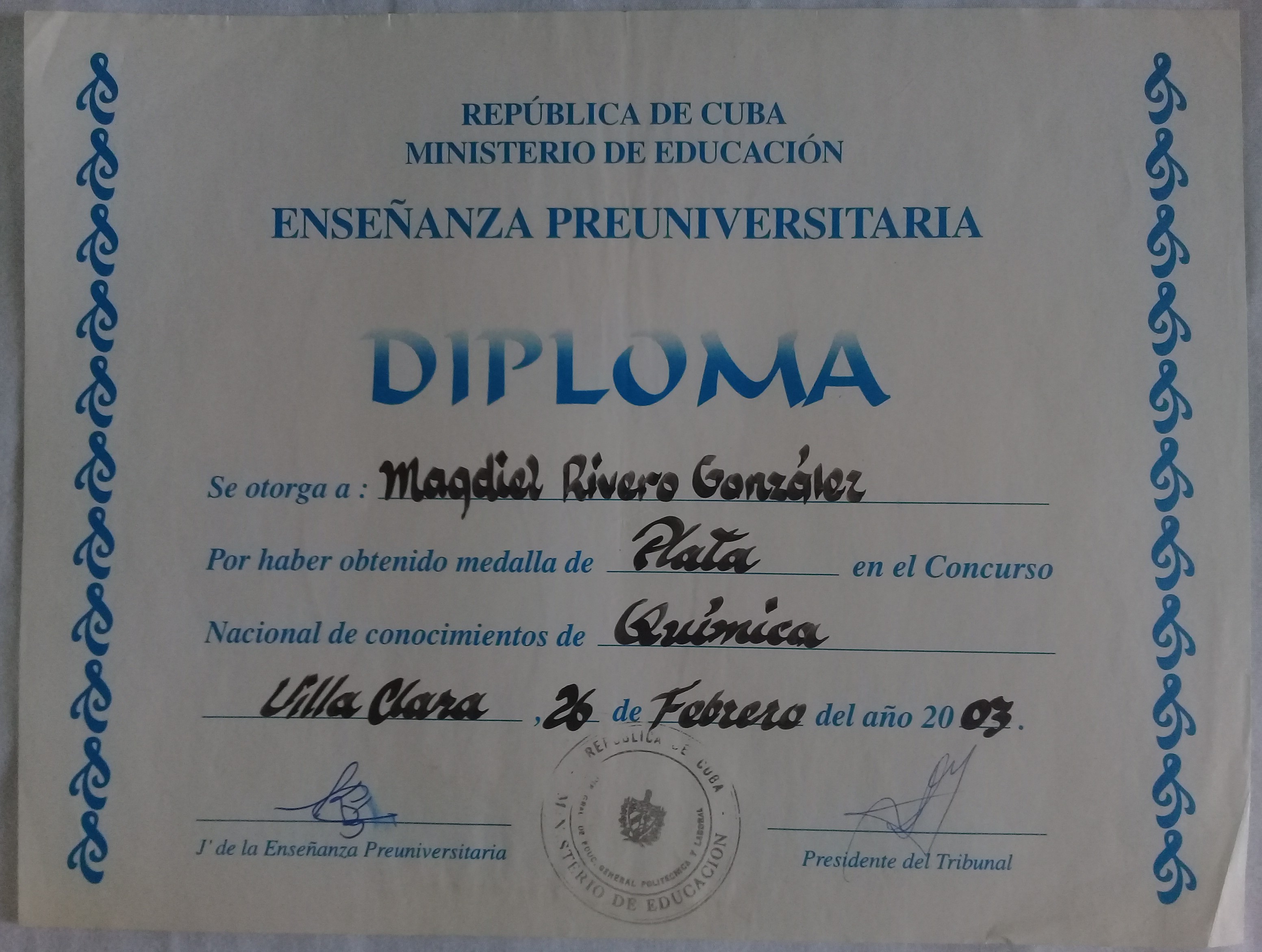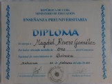 - Third place in the provincial Chemistry contest at 9th grade gaining admission to the Vocational Institute of Exact Sciences.